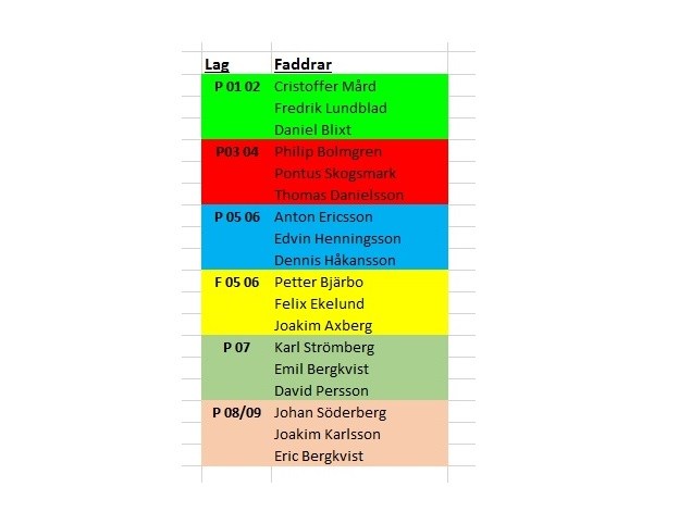 Till ungdomsledare i Ingelstad IBK, Som vi pratade om på kickoffen så kommer samtliga a-lagsspelare i år att vara faddrar för våra ungdomslag. Tanken är att de ska närvara vid minst två träningar under säsongen, och gärna någon match. Hur ni lägger upp det lägger vi på er att komma överens om inbördes. På bilden finner ni vilka spelare som är faddrar för vilka lag. Kontaktuppgifter för samtliga spelare finns på http://www.laget.se/iibkherr.