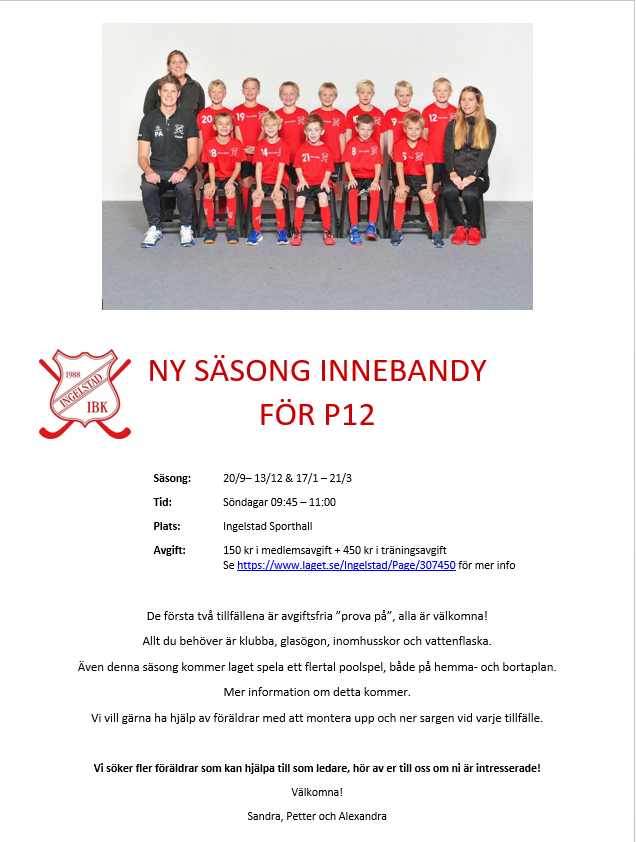 Hej, Nu är det dags att starta upp en ny säsong med Innebandy för P12. Välkomna till Sporthallen Söndag 27/9 09:45-11:00.