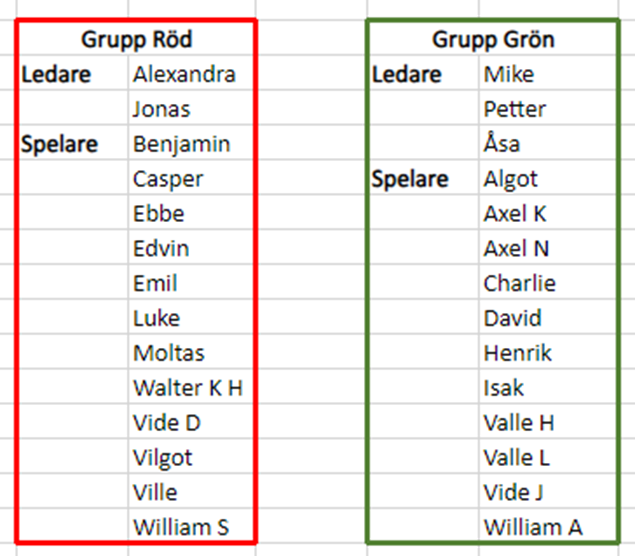 Hej alla! Vi har nu kommit igång med matcherna för laget och det är riktigt kul att se hur bra spelarna hittat varandra! Det är 5 sammandrag kvar innan jul och vi har tänkt testa med lite gruppindelningar för de 4 första. Anledningen till det är att vi vill få mer speltid för de spelare som är med på respektive match. Röd grupp kommer spela sammandragen 11/11 och 26/11 Grön grupp kommer spela sammandragen 19/11 och 25/11 Alla kommer spela sammandraget 9/12 Grupperna ser ni i bifogad bild! Om ni har förhinder något av dessa datum, så vill vi att ni hör av er till någon av oss ledare så fort som möjligt, så ska vi se om vi kan flytta runt något. Kallelser till aktuella spelare kommer ut inför varje sammandrag, glöm inte svara på dessa i tid! Hur vi gör efter nyår återkommer vi till, men troligen kommer vi göra gruppindelningar då också. Ett uppdaterat schema med matcher och funktionärer finns här>> Kolla på detta, så ni inte missar när vi behöver er hjälp i sekretariat och kiosk. Har ni förhinder något av dessa datum, så vill vi att ni byter med någon annan förälder och meddelar oss bytet. Har ni några frågor så hör av er! //Ledarna P12