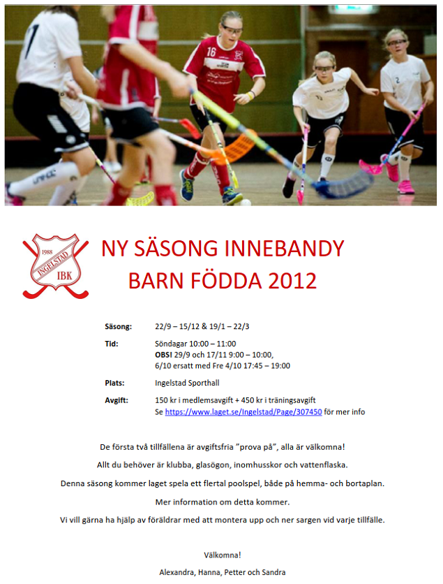 Nu startar vi en ny säsong med innebandy! Välkomna till Sporthallen Söndag 22/9 10:00-11:00.